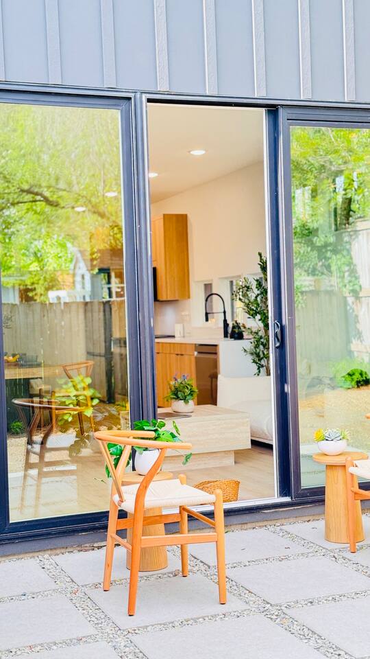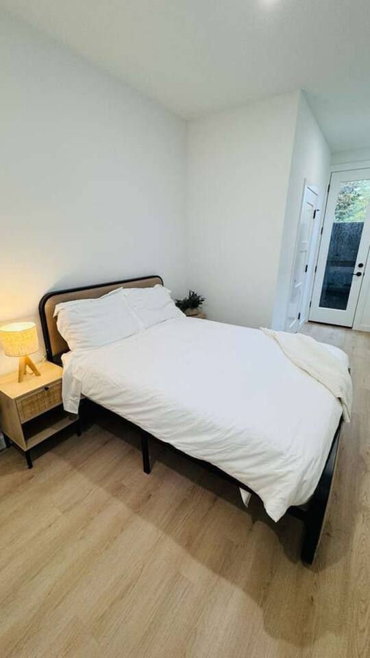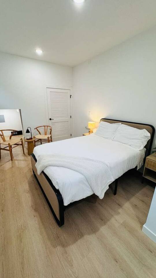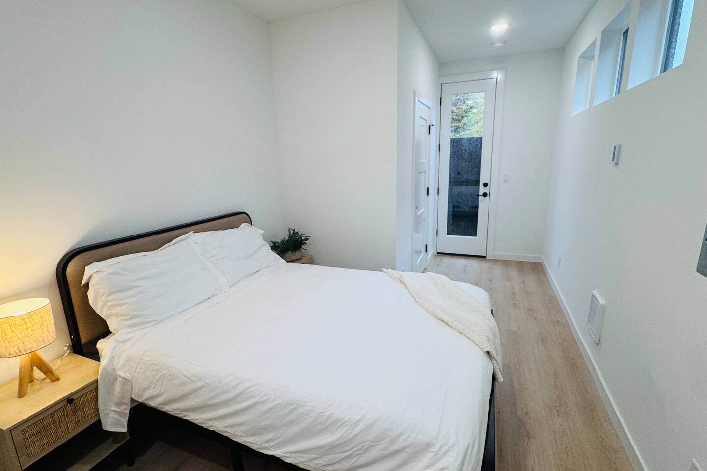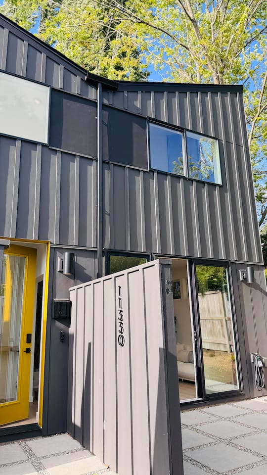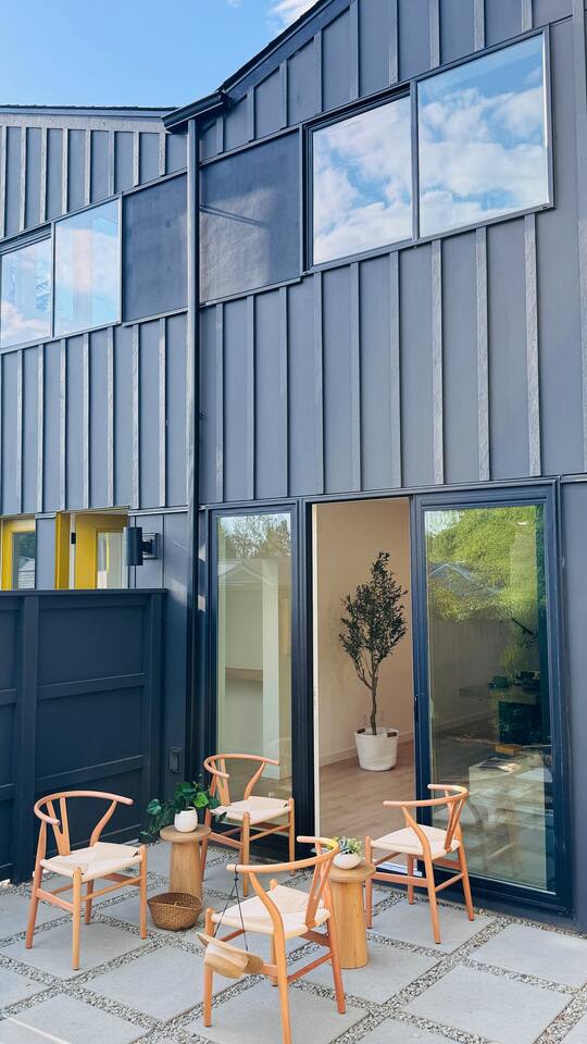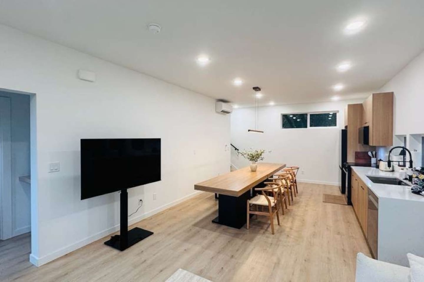 π Modern Luxury & Comfort: Step into your newly built designer retreat, featuring up to 15-ft ceilings, skylights, and oversized windows that fill the home with natural light. Every corner of this 4-bedroom, 2-bath home is crafted for elegance and function β perfect for families, business travelers, or long-term guests. β‘οΈ Modern Amenities: High-end finishes and contemporary design Samsung Bespoke appliances for a premium kitchen experience Central A/C and heating for year-round comfort Regular outdoor outlet by the front door to charge your EV (bring your own adapter and charging cable) In-unit washer and dryer for convenience π³ Gourmet Kitchen: Fully equipped kitchen with cookware, dishware, and utensils Sleek Samsung Bespoke refrigerator, oven, and microwave Coffee maker, toaster, and dining area for six π Sleeping Arrangements: Primary Bedroom: King bed with ensuite bath Bedrooms 2β3: Each with plush queen beds and storage Bedroom 4: Full bed. No curtain available Premium bedding and blackout curtains for restful sleep π³ Private Outdoor Space: Enjoy a private yard β ideal for morning coffee, reading, or entertaining guests Patio seating area and green space for relaxation π Convenient Parking: 1 assigned parking space in front of the house Tight driveway shared with the neighboring home β please park carefully Garage available but compact β best suited for small vehicles Free street parking also available nearby π§Ί Laundry: In-unit washer & dryer