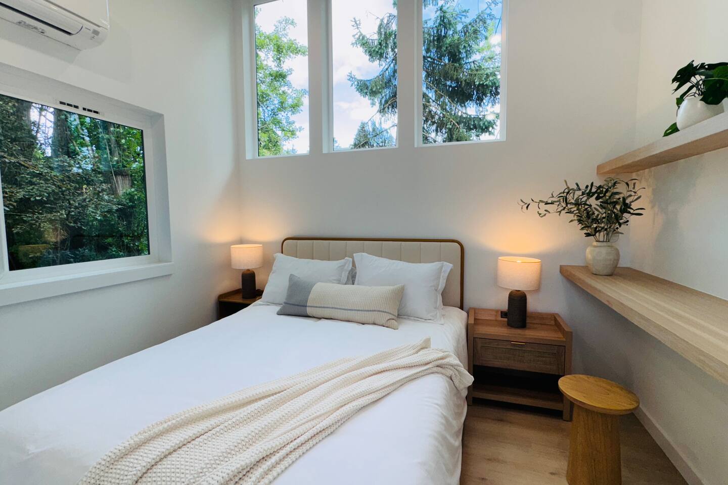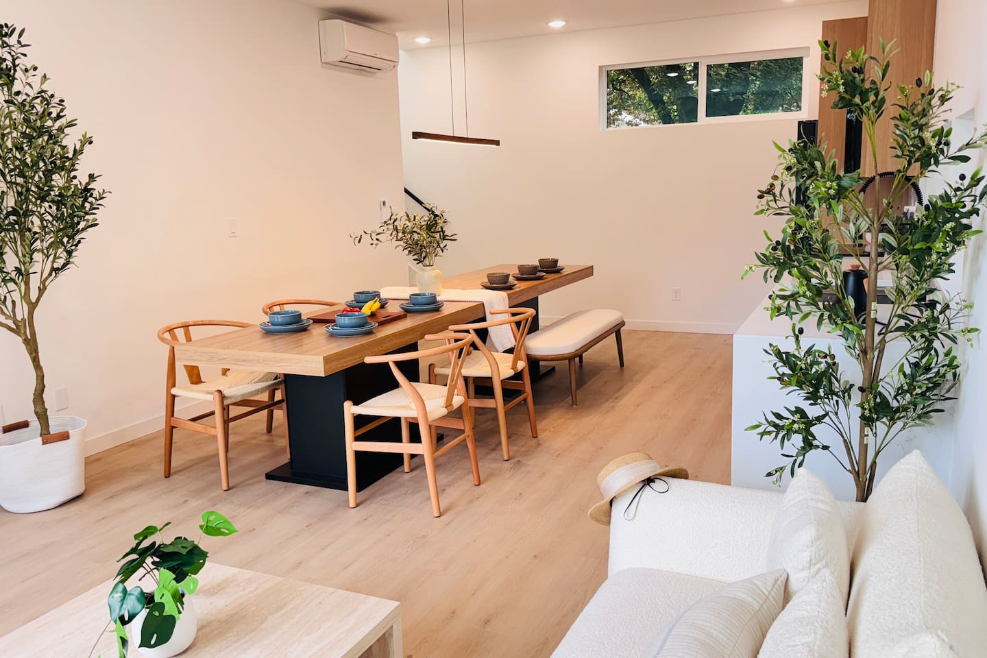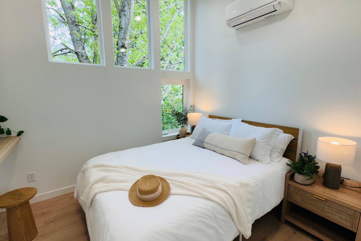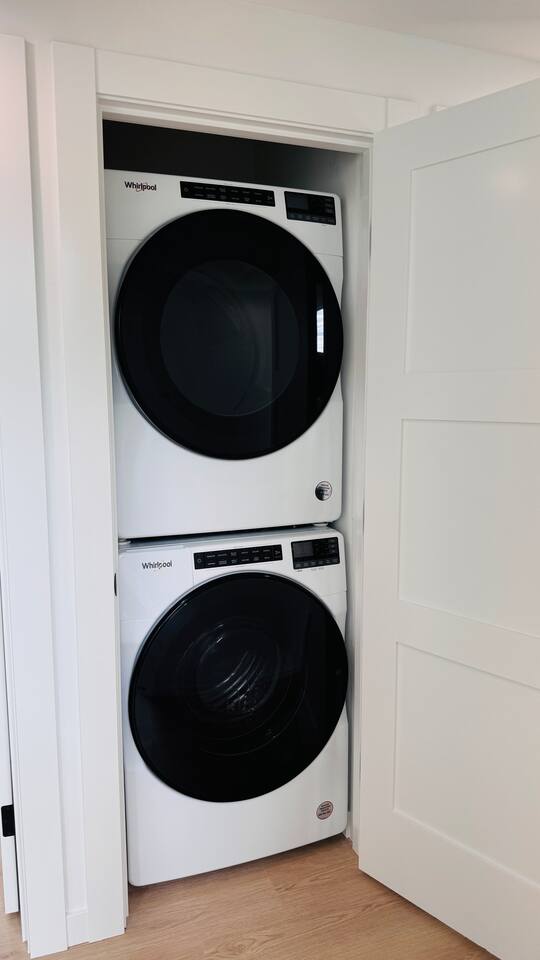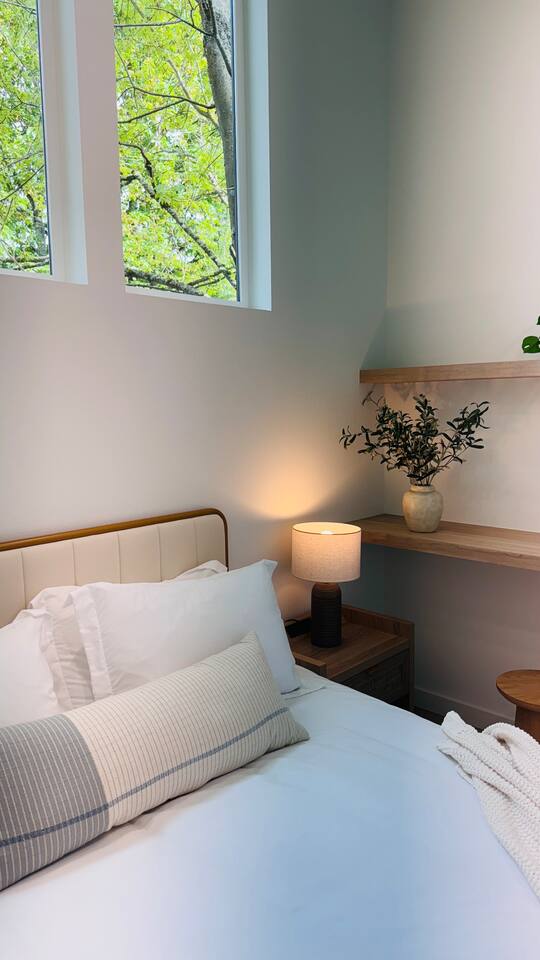 π Modern Luxury & Comfort: Step into your newly built designer retreat, featuring up to 15-ft ceilings, skylights, and oversized windows that fill the home with natural light. Every corner of this 4-bedroom, 2-bath home is crafted for elegance and function β perfect for families, business travelers, or long-term guests. β‘οΈ Modern Amenities: High-end finishes and contemporary design Samsung Bespoke appliances for a premium kitchen experience Central A/C and heating for year-round comfort Regular outdoor outlet by the front door to charge your EV (bring your own adapter and charging cable) In-unit washer and dryer for convenience π³ Gourmet Kitchen: Fully equipped kitchen with cookware, dishware, and utensils Sleek Samsung Bespoke refrigerator, oven, and microwave Coffee maker, toaster, and dining area for six π Sleeping Arrangements: Primary Bedroom: King bed with ensuite bath Bedrooms 2β3: Each with plush queen beds and storage Bedroom 4: Full bed. No curtain available Premium bedding and blackout curtains for restful sleep π³ Private Outdoor Space: Enjoy a private yard β ideal for morning coffee, reading, or entertaining guests Patio seating area and green space for relaxation π Convenient Parking: 1 assigned parking space in front of the house Tight driveway shared with the neighboring home β please park carefully Garage available but compact β best suited for small vehicles Free street parking also available nearby π§Ί Laundry: In-unit washer & dryer