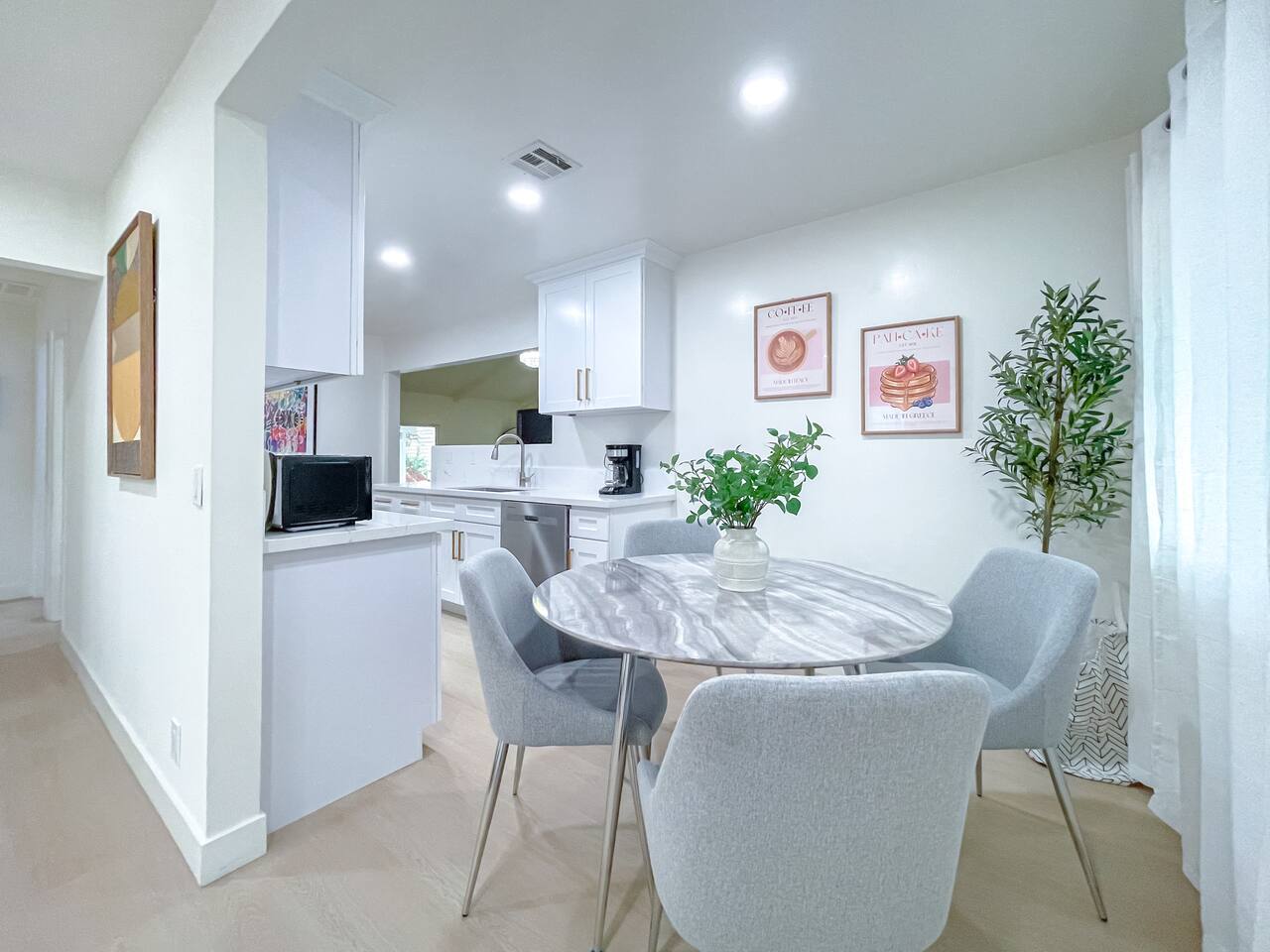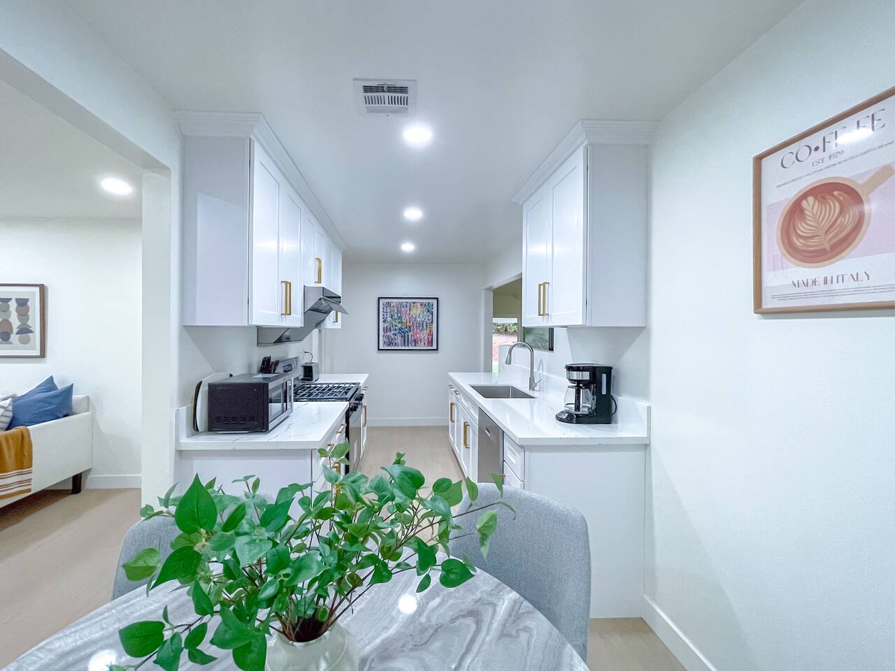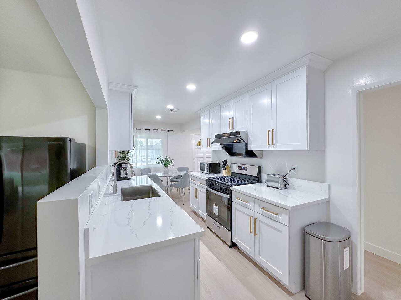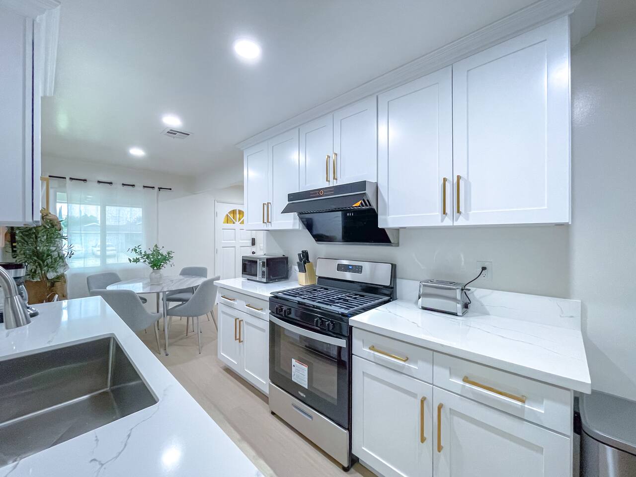 This entire private single-family home offers a comfortable, family-friendly layout with two living rooms, allowing everyone to relax without feeling crowded—ideal for families traveling together or multi-generational groups. 🏡 Home Overview Single-story home Private entrance Two separate living rooms for extra space & flexibility Central air conditioning Steps present on property 🛋️ Living Spaces Main Living Room: Large seating area 78” Smart TV Perfect for movie nights and group gatherings Second Living Room: Separate, quieter space Ideal for kids, reading, remote work, or relaxing away from the main TV (No cable provided—guests may log into their own streaming accounts.) 🛏️ Bedrooms & Sleeping Arrangements Primary Bedroom: King bed + ensuite bathroom Bedroom 2: King bed Bedroom 3: King bed Bedroom 4: Queen bed Fresh linens, pillows, towels, and extra blankets are provided. Additional towels are available in an unlocked closet. 🍳 Kitchen & Dining Fully equipped kitchen Pots, pans & cooking basics (oil, salt & pepper) Dishes, silverware, cups & wine glasses Coffee maker with coffee provided Dishwasher & garbage disposal 🧺 Laundry & Essentials Washer & dryer Vacuum Hair dryer Shampoo, conditioner & body wash Iron, ironing board & hangers 👶 Family-Friendly Amenities Crib High chair 🚗 Parking Garage parking Driveway parking Street parking available